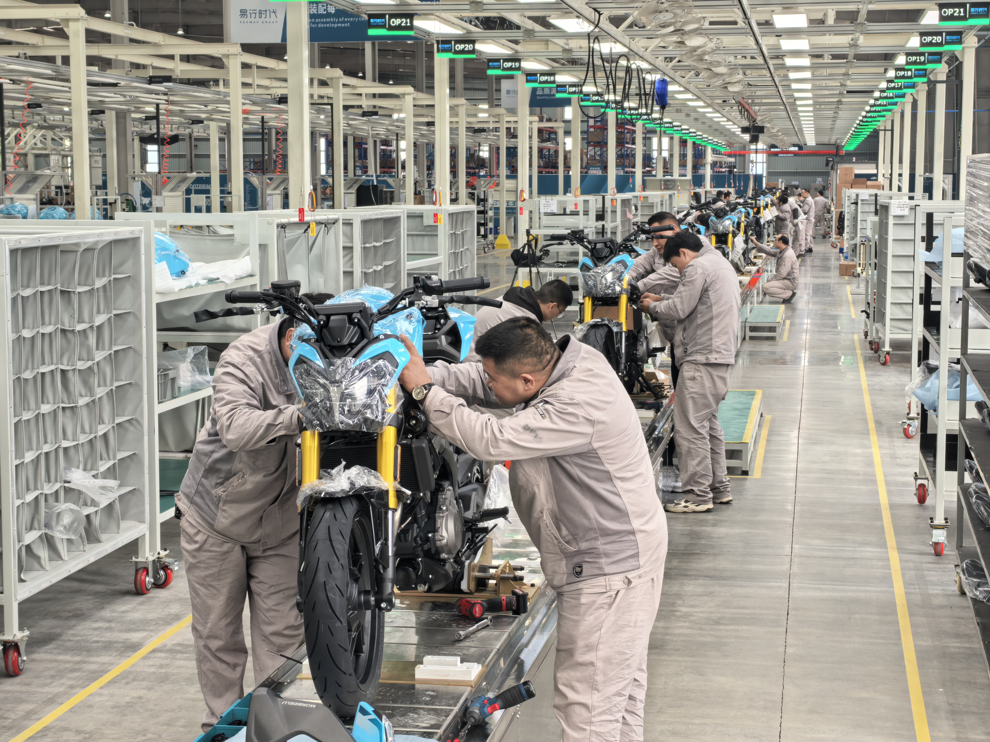 早晨九点,四川易行时代西南生产基地车间内,AGV智能运输车沿轨道精准输送零部件,工人们正专注完成首批出口欧洲的M71燃油摩托车收尾组装。