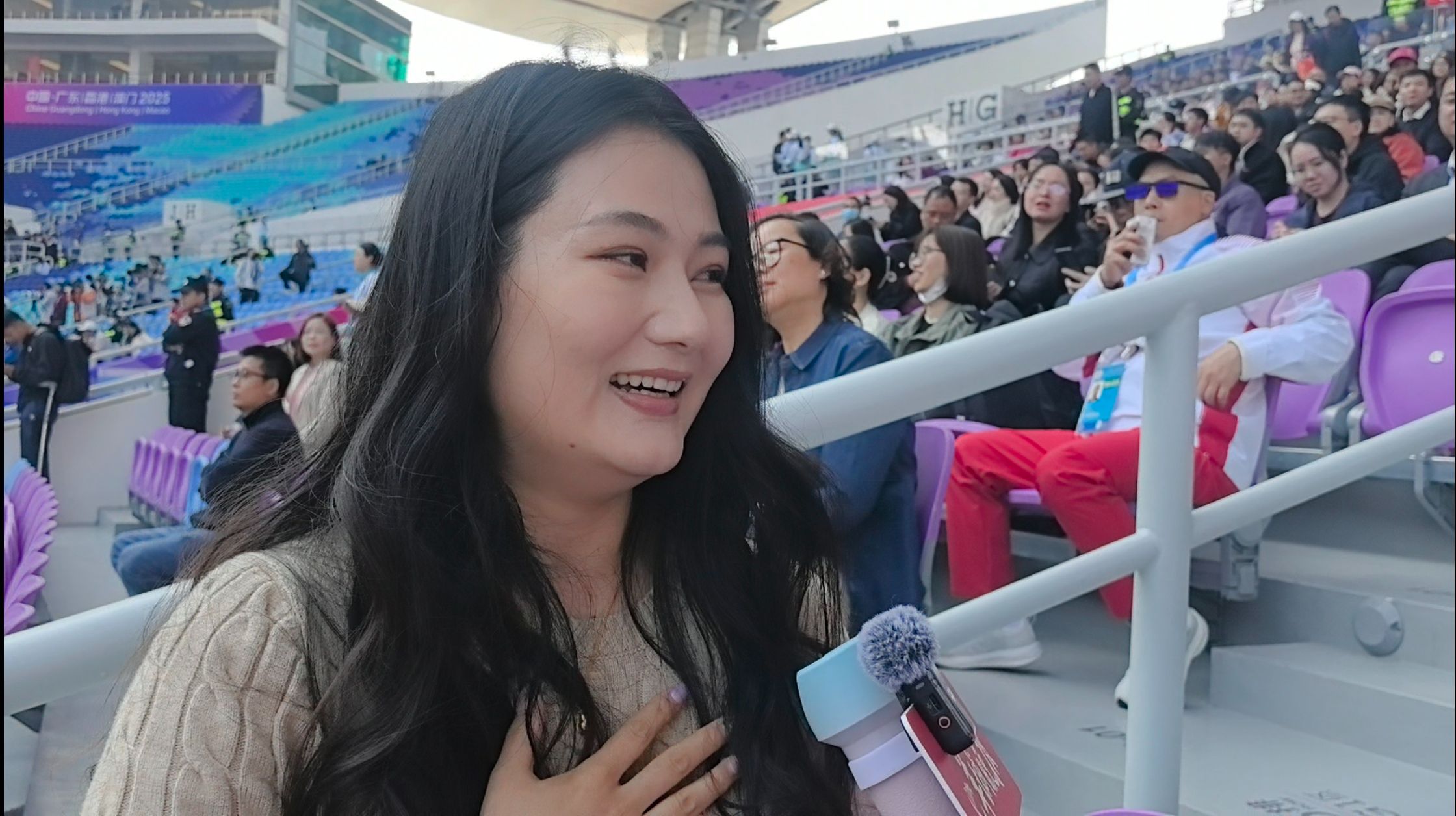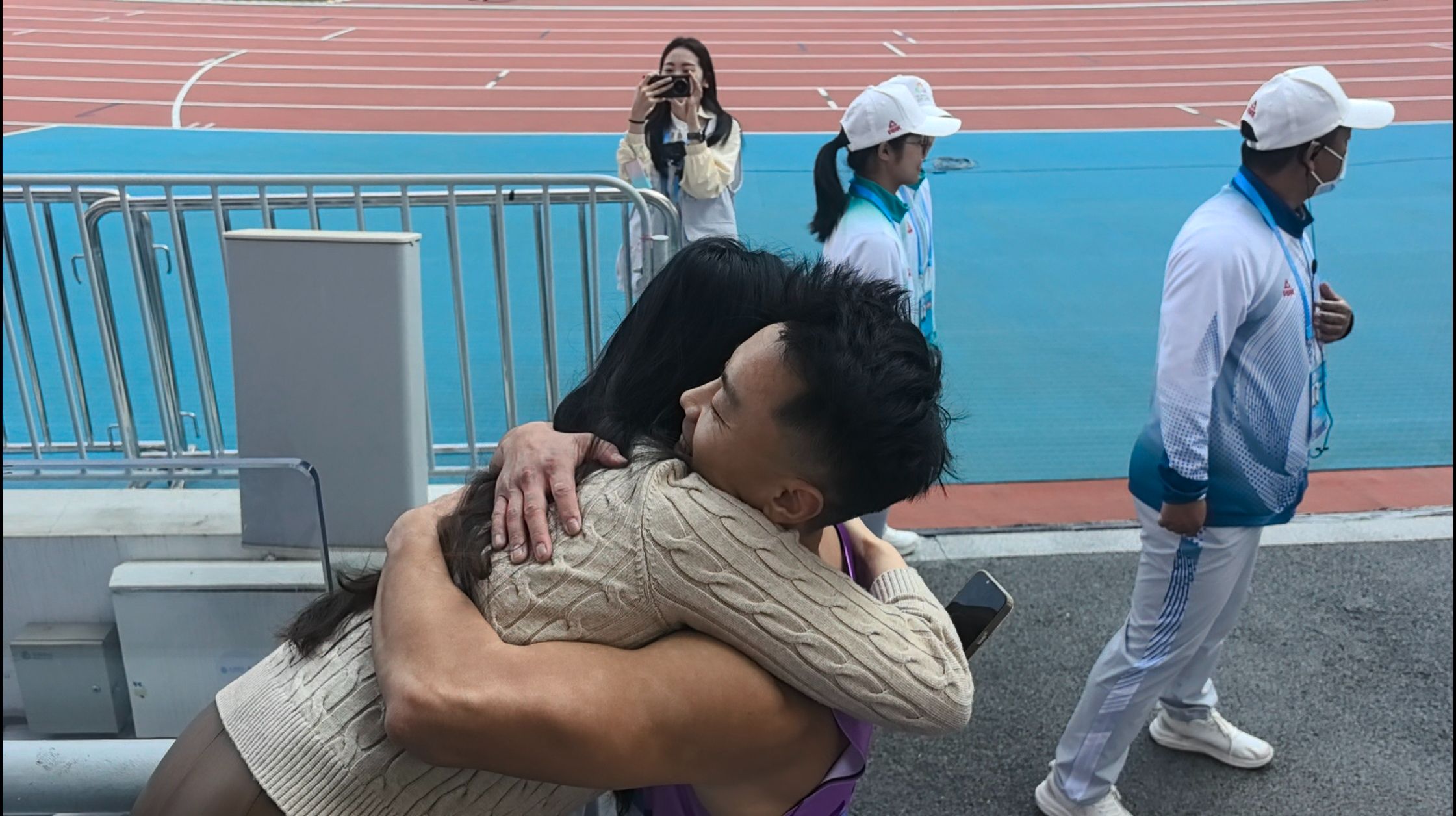 在胡玉涛率先冲过终点线的时候,观众席上的妻子王文杰兴奋地手舞足蹈,随后第一时间为丈夫送上了拥抱。“他已经准备了4年了,我们的孩子刚5个月,我是带着吸奶器来看他比赛的,就是希望他有一颗定心丸,能一举拿下比赛。”赛后,王文杰在接受记者采访时,言语间满是对丈夫的心疼与骄傲。她坦言,这场比赛的胜负悬念不小,胡玉涛的对手实力强劲,从昨晚到今天早上,全家都被紧张情绪笼罩,“刚才我还一直催他做准备,因为他自己也没有完全的把握能拿冠军”。
