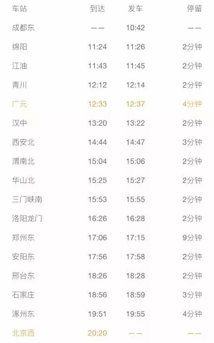广元至北京西开行G308次动车