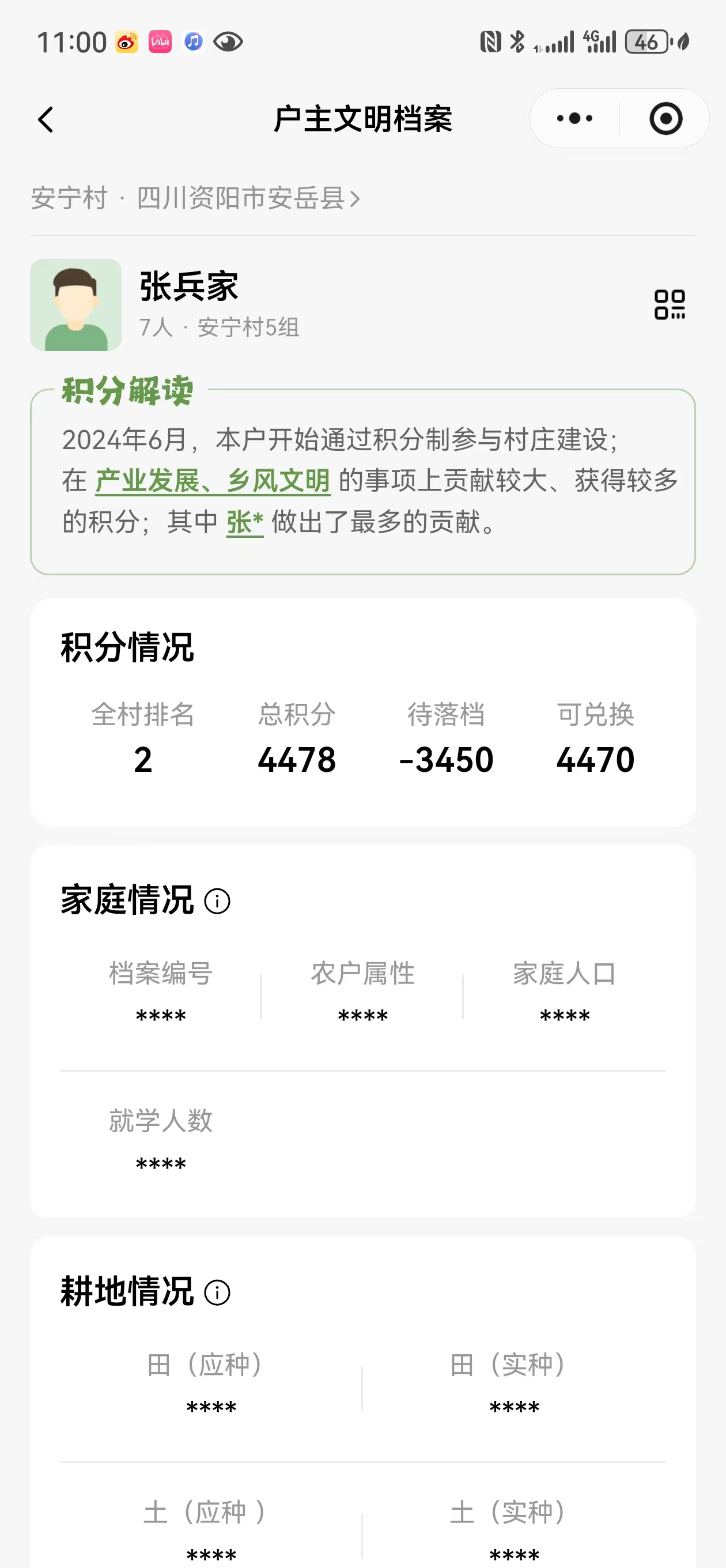 在乡村治理数字化平台上各户公开可见的积分情况。