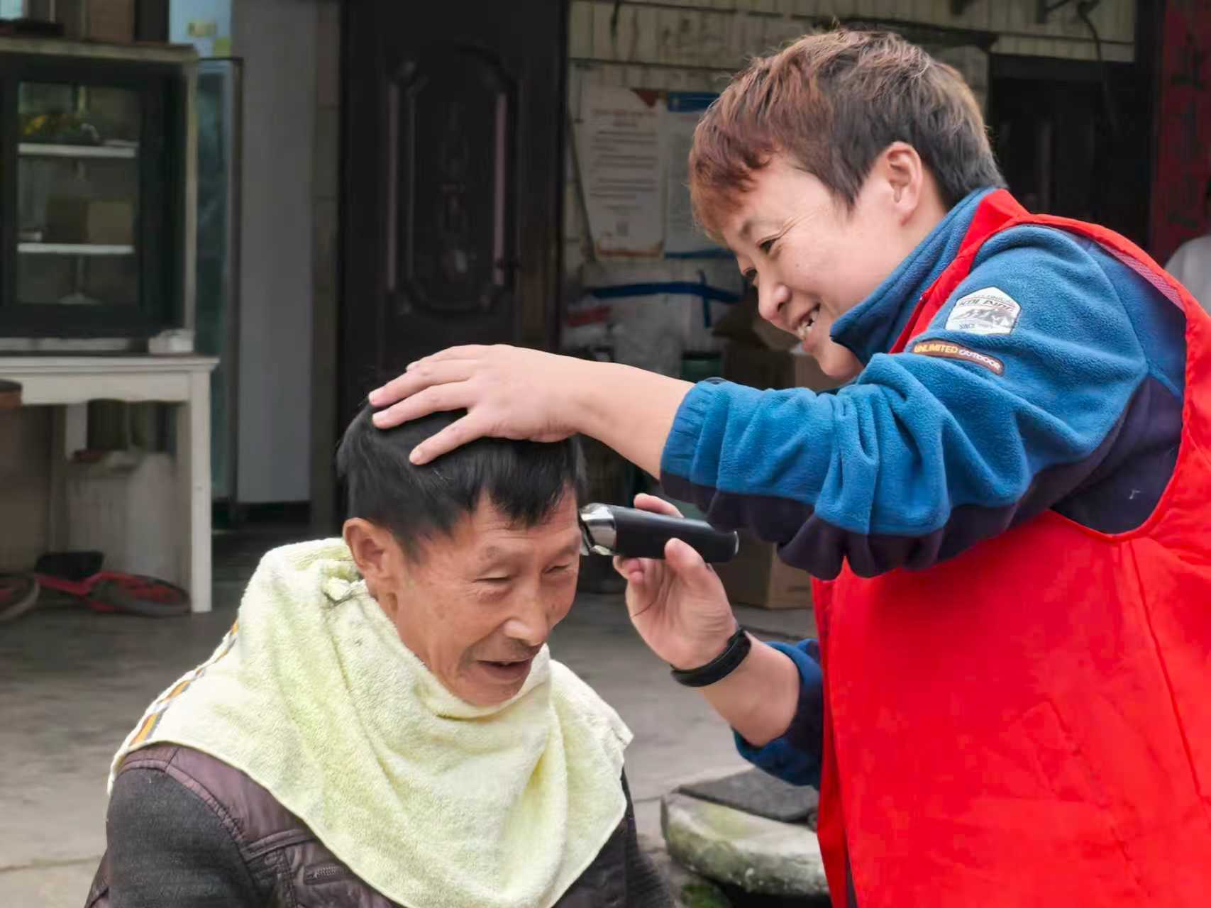 在通贤镇安宁村,村民用积分兑换理发服务。潘政吉 摄