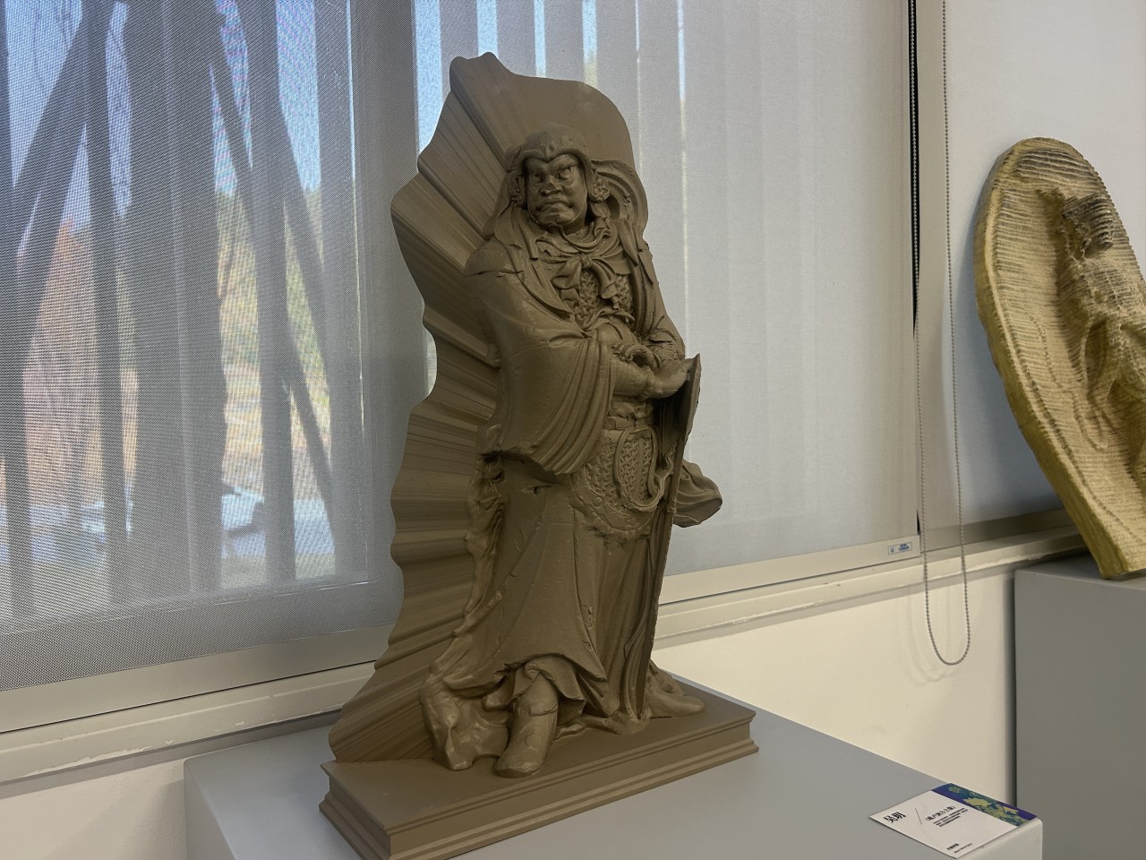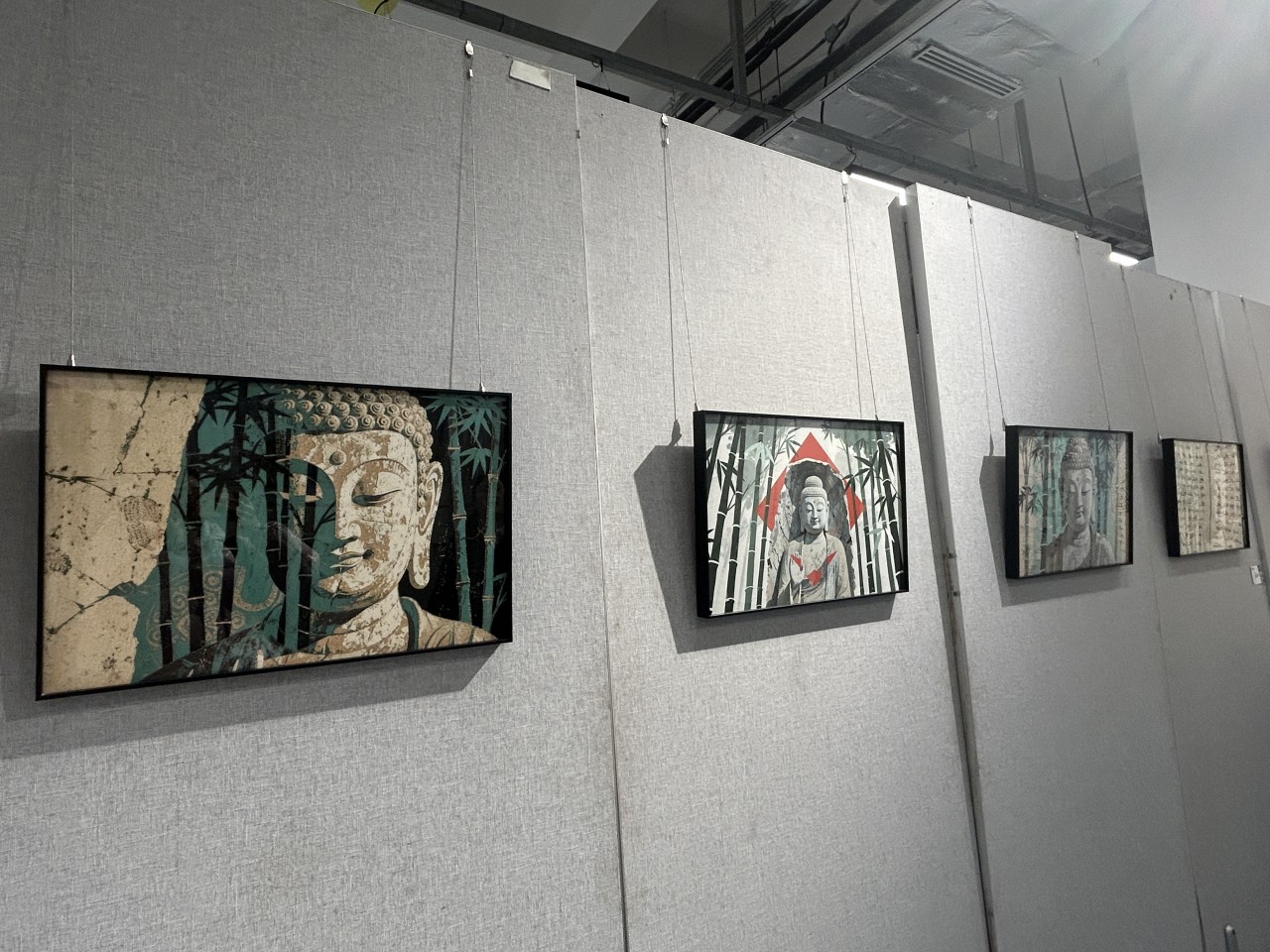而在这场艺术盛宴中,来自资阳本地的安岳石刻元素,成为动人的“在地密码”:《坐见千年》以版画肌理复刻石刻风貌,《毗卢洞力士像》用数字雕塑还原造像的力量感,《石佛青岚》以传统佛教造像为内核,通过当代艺术语言重构石刻艺术的视觉表达……“我以佛像面部特写为主体,结合竹林剪影的虚实重叠,以粗犷的油画笔触模仿千年石刻的凿痕质感,同时保留水彩的透明层叠感,形成历史与当下的对话。”《石佛青岚》创作者马星玥向记者介绍作品创作思路。