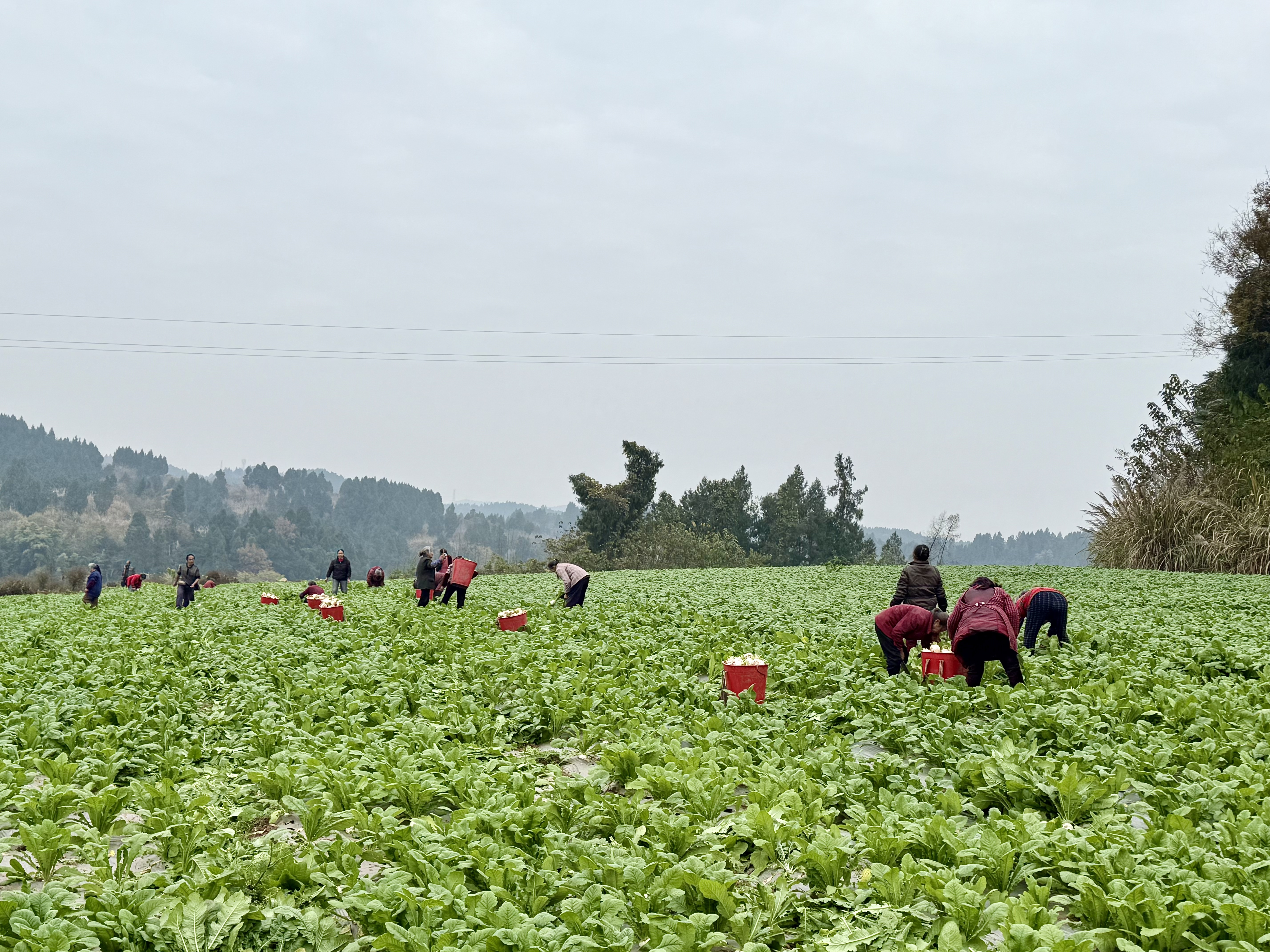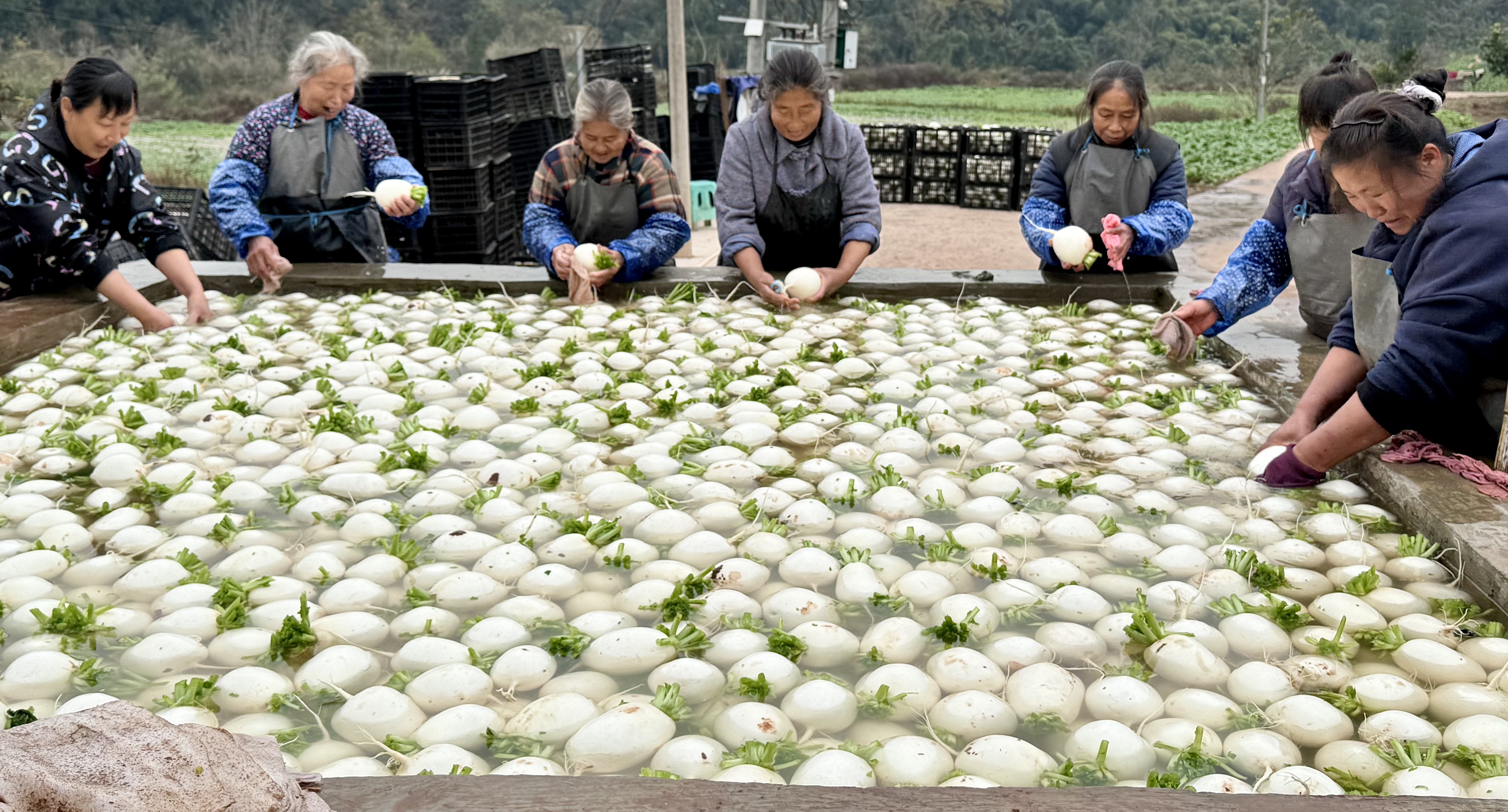 近日,记者在乐至县佛星镇康颖家庭农场的菜地里看到,数十名村民正弯腰采收萝卜,清洗、分拣、装车……现场忙碌又有序。农场负责人丁敦全穿梭其间,脸上洋溢着丰收的快乐。