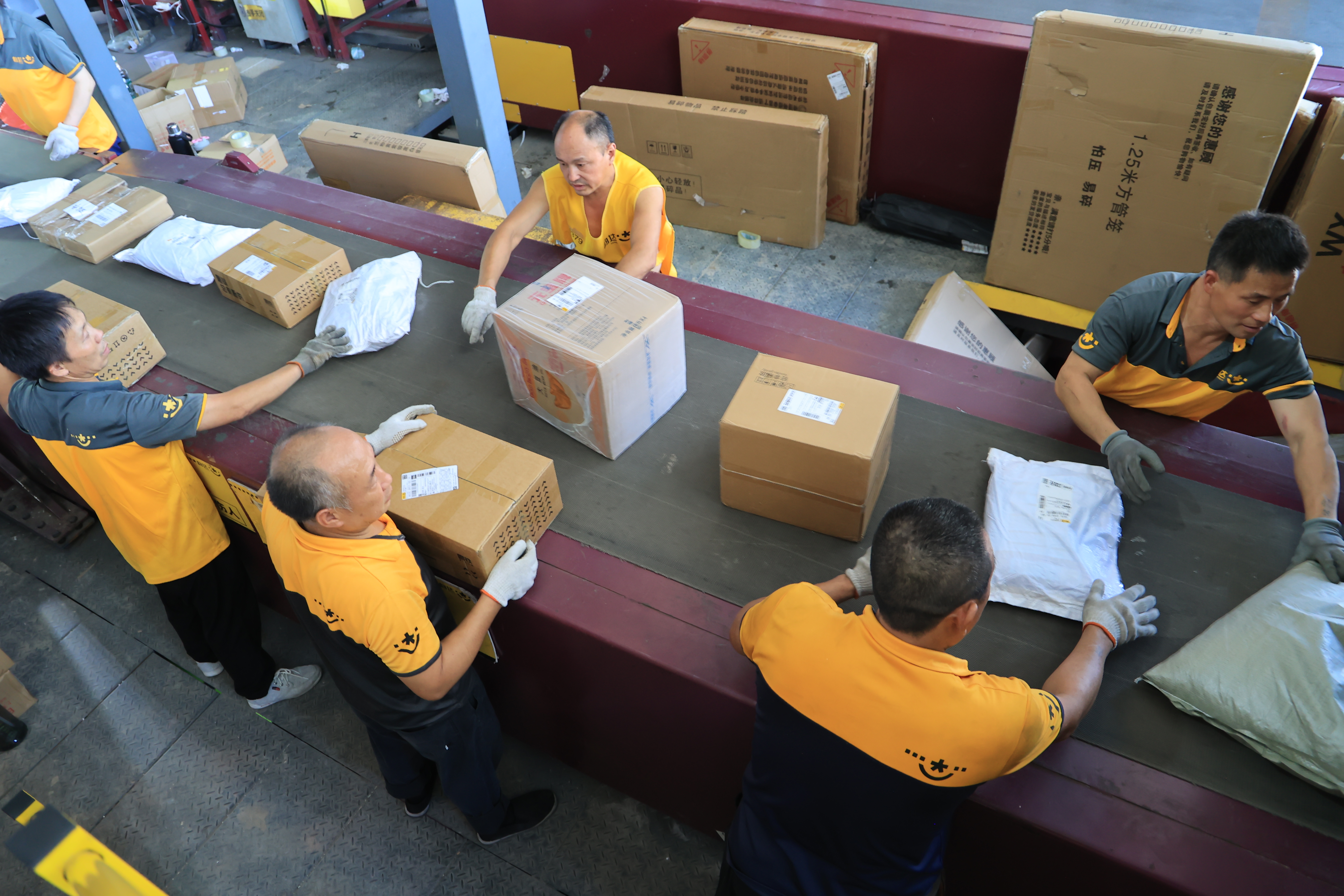 工人们忙着分拣包裹。