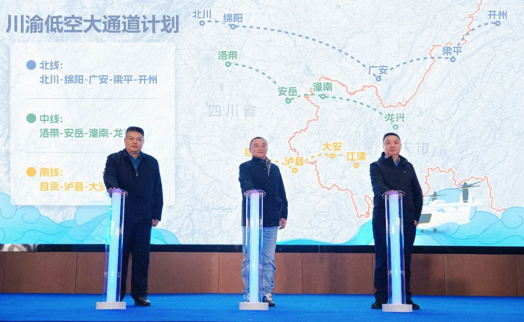 现场还同步发布《北线、中线、南线三条川渝低空大通道计划》,绘制了未来川渝低空互联互通、成网成系的宏伟蓝图。其中,中线串联洛带—安岳—潼南—龙兴。