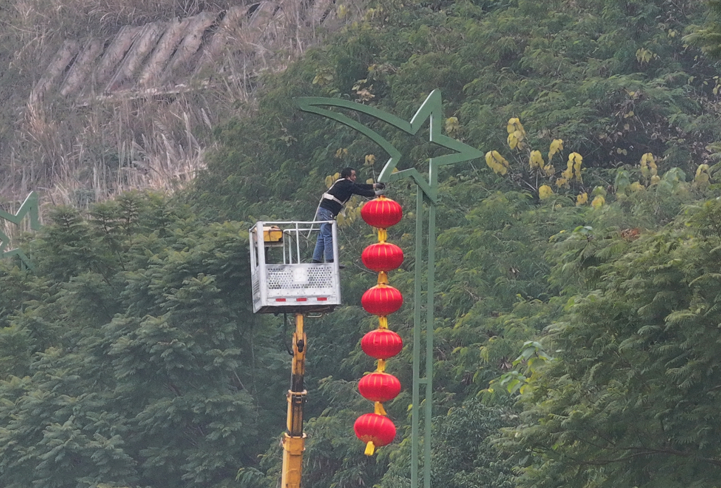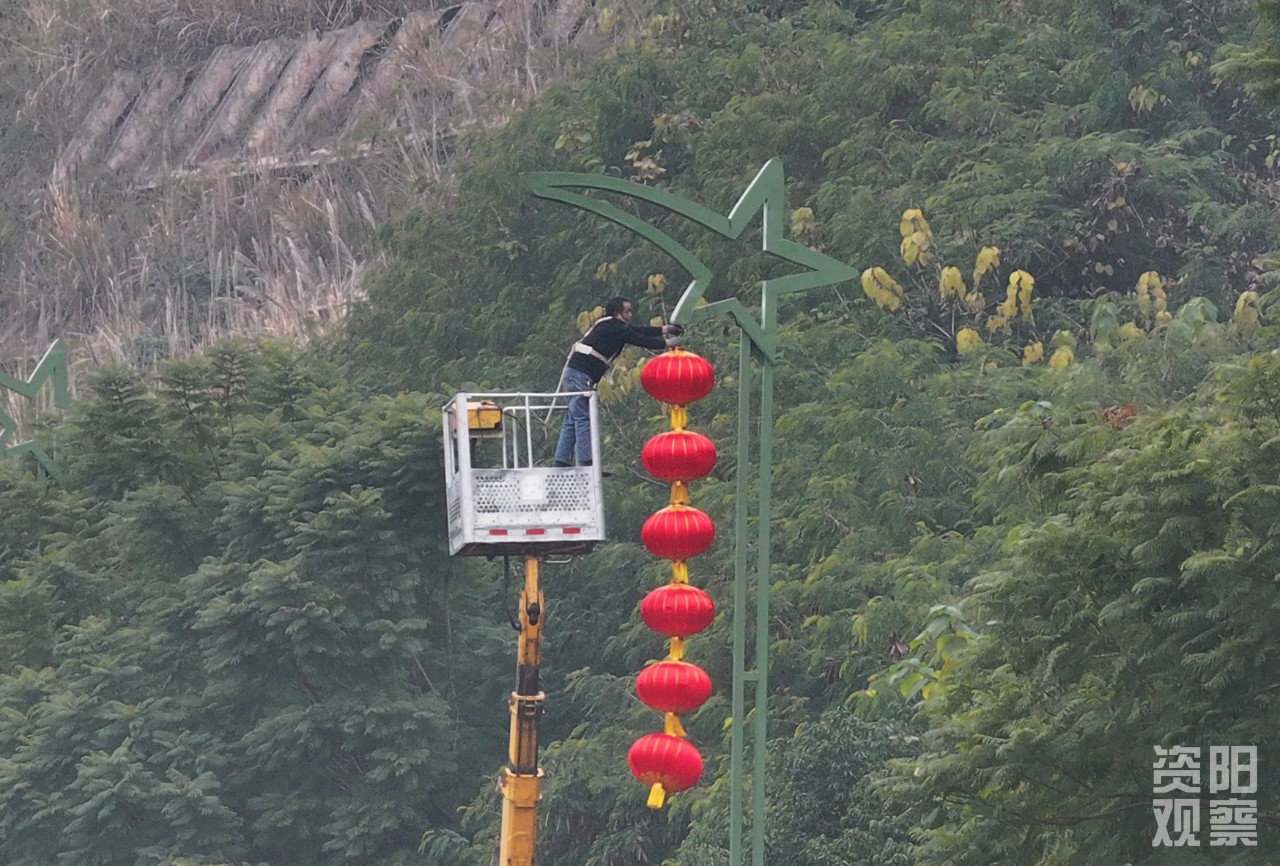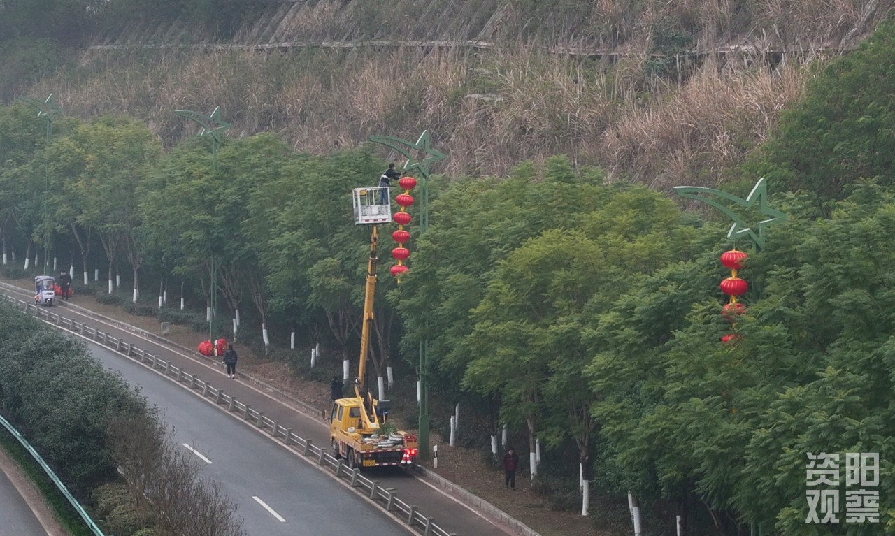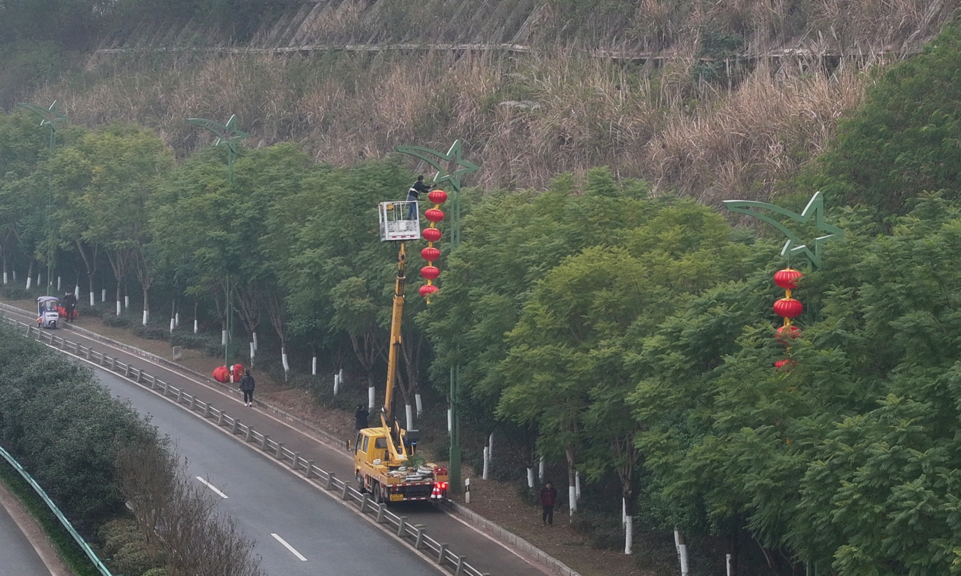 近日,记者在陈毅故居旅游大道看到,工作人员正在作业现场忙碌。升降车缓缓升起,地面人员默契配合,传递灯笼、协助固定,一盏盏崭新的红灯笼在路灯杆上依次“安家”,随风轻摆间传递出浓浓的节日氛围。