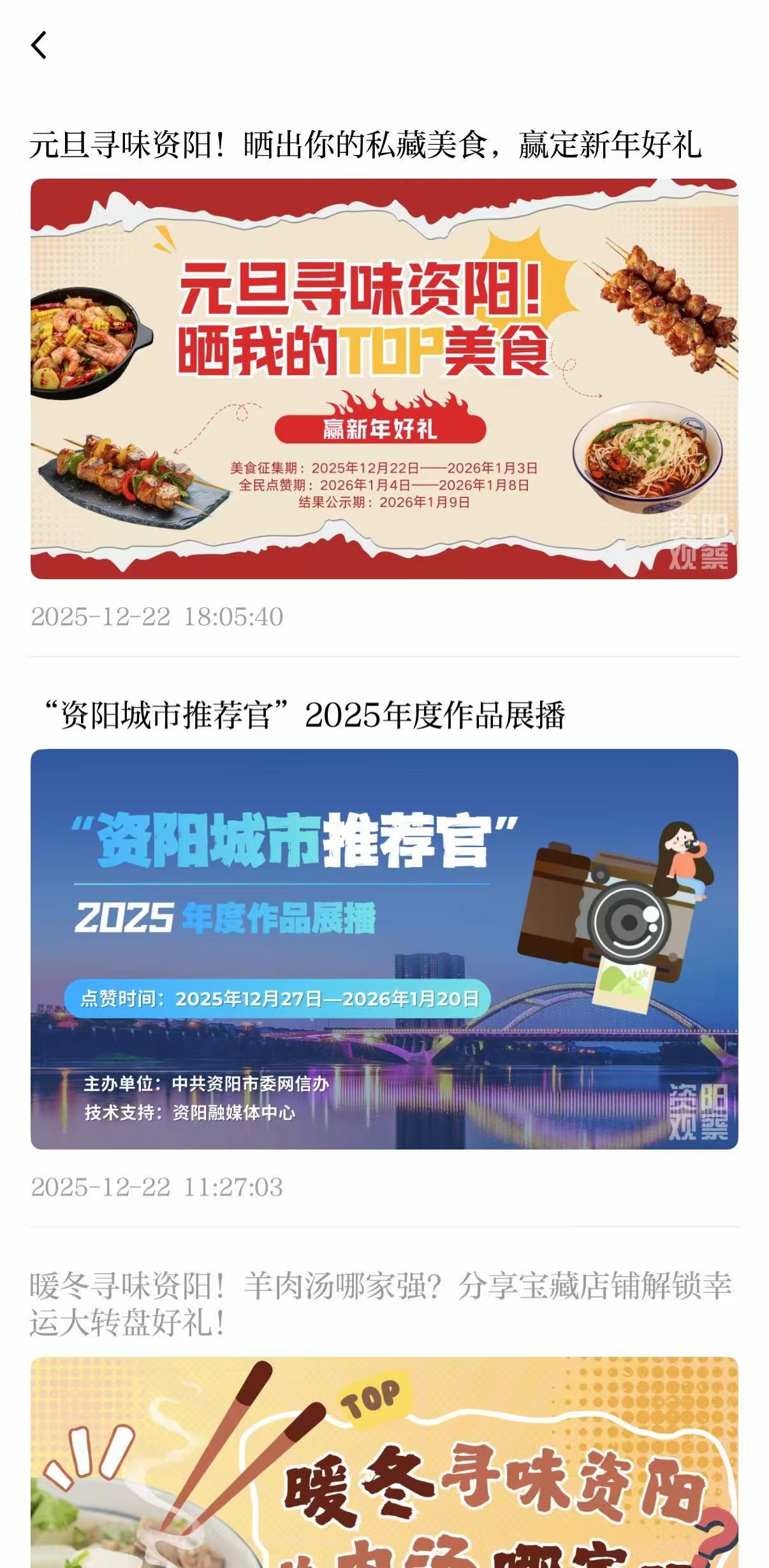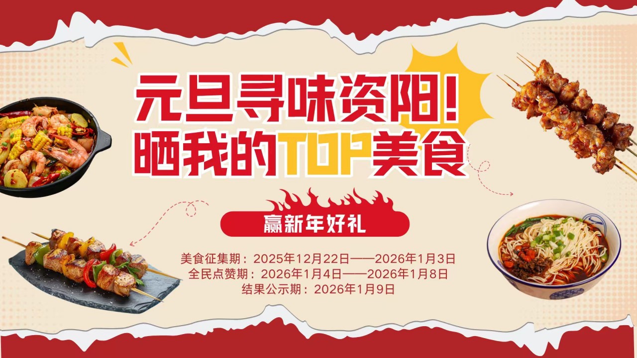 为深挖本土饮食底蕴,让元旦更有滋味,“资阳观察”APP特别策划推出“元旦寻味资阳!晒我的TOP美食”主题活动。以美食为桥,邀请市民晒出自己的私藏美味,用点赞汇聚人气,用文创好礼回馈热爱,共同营造“全民分享、共品美味”的节日氛围。