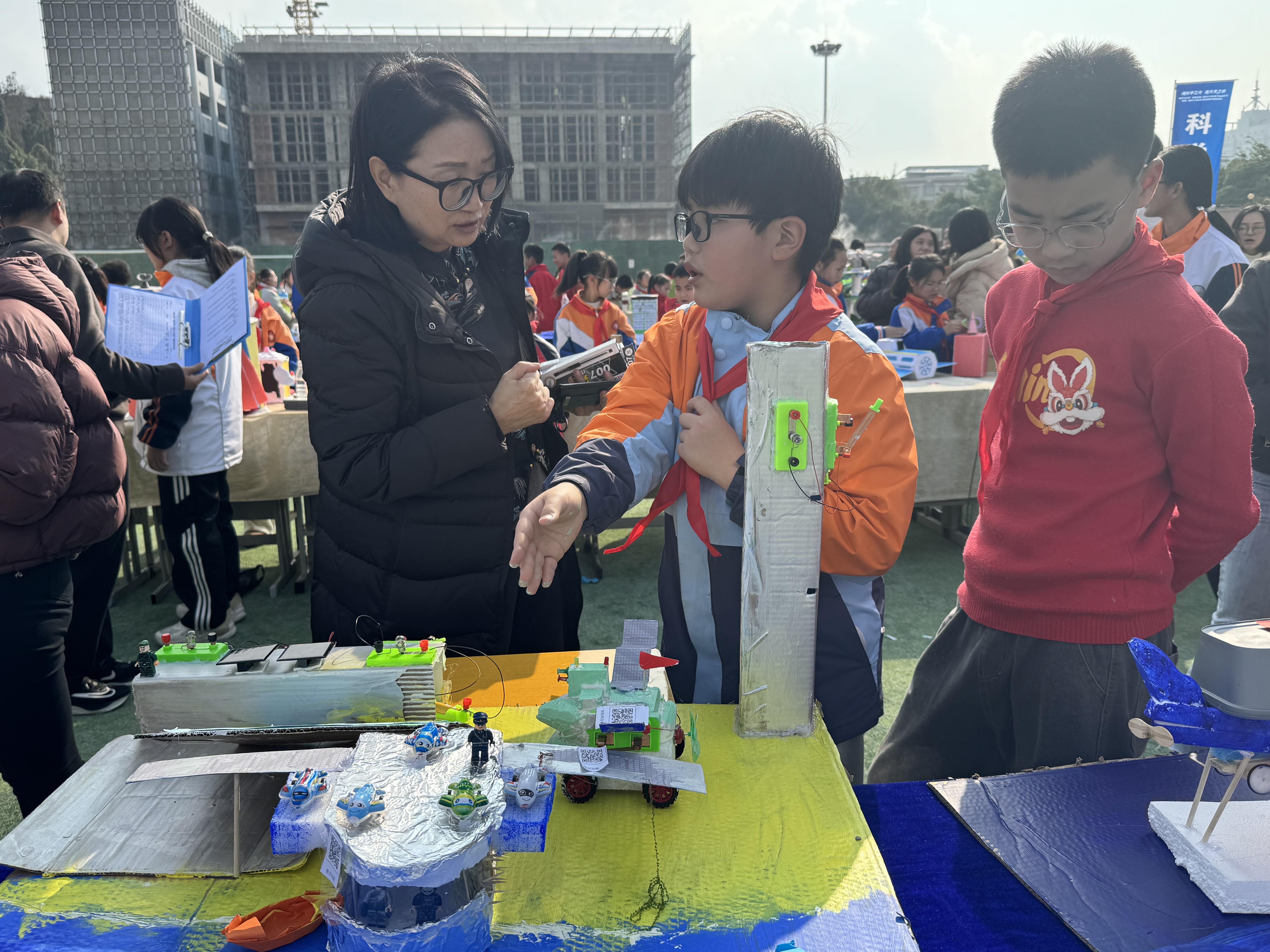 活动于当日14:40启动,现场设置了“科学实验秀”“我与AI共创造创意模型”“科学教育成果展示”三大核心展区。展品涵盖了机器人结构模型、生活实用发明、环保创意装置及编程智能作品等多种门类。在开放式的展示空间里,抽象的科学原理转化为具象的互动体验,学生们在动手操作中交流创作思路,现场互动热烈,探索氛围浓厚。