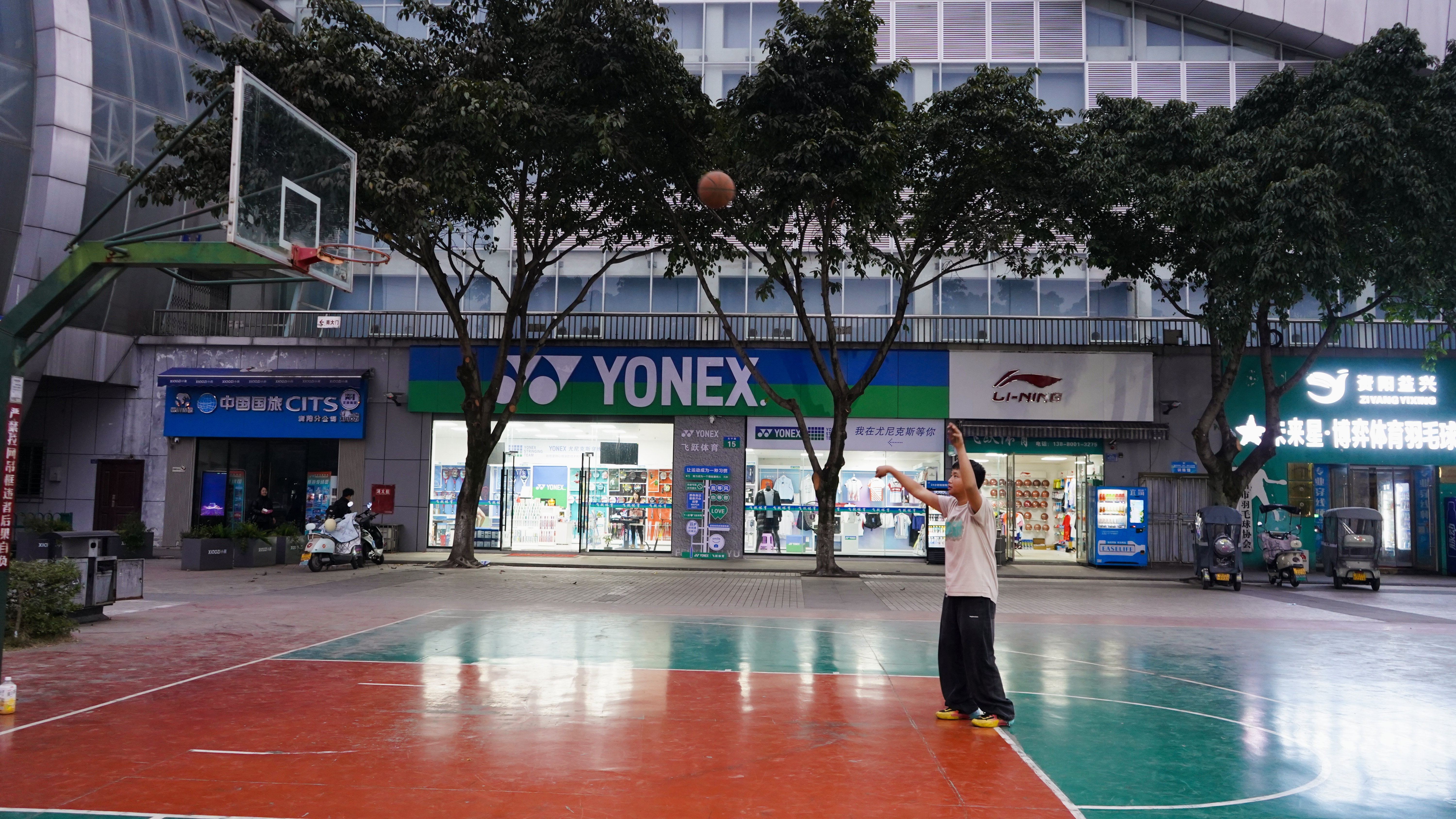 学生在体育广场打篮球。