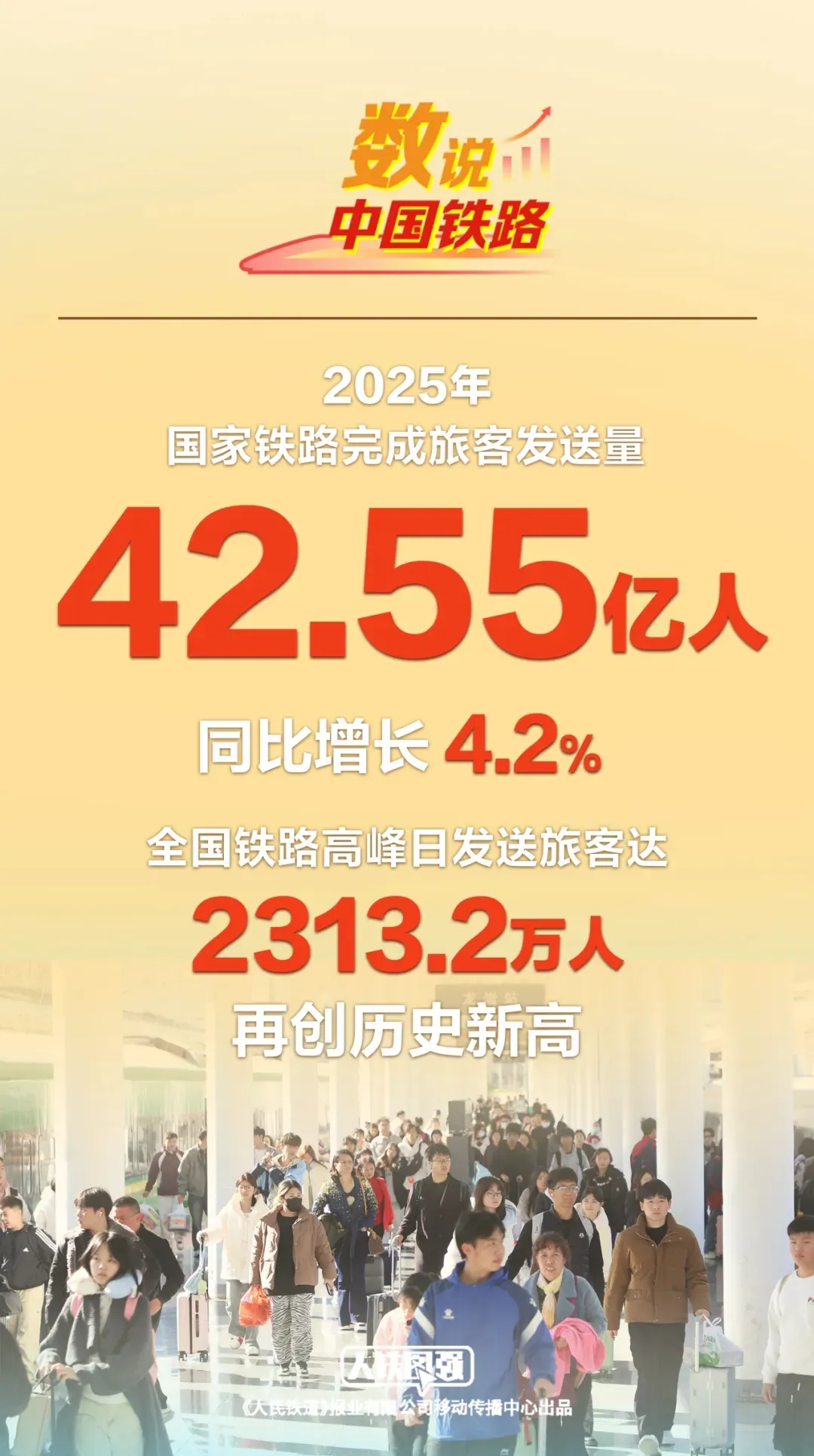 2025年,国家铁路完成旅客发送量42.55亿人、同比增长4.2%,全国铁路高峰日发送旅客达2313.2万人,再创历史新高。