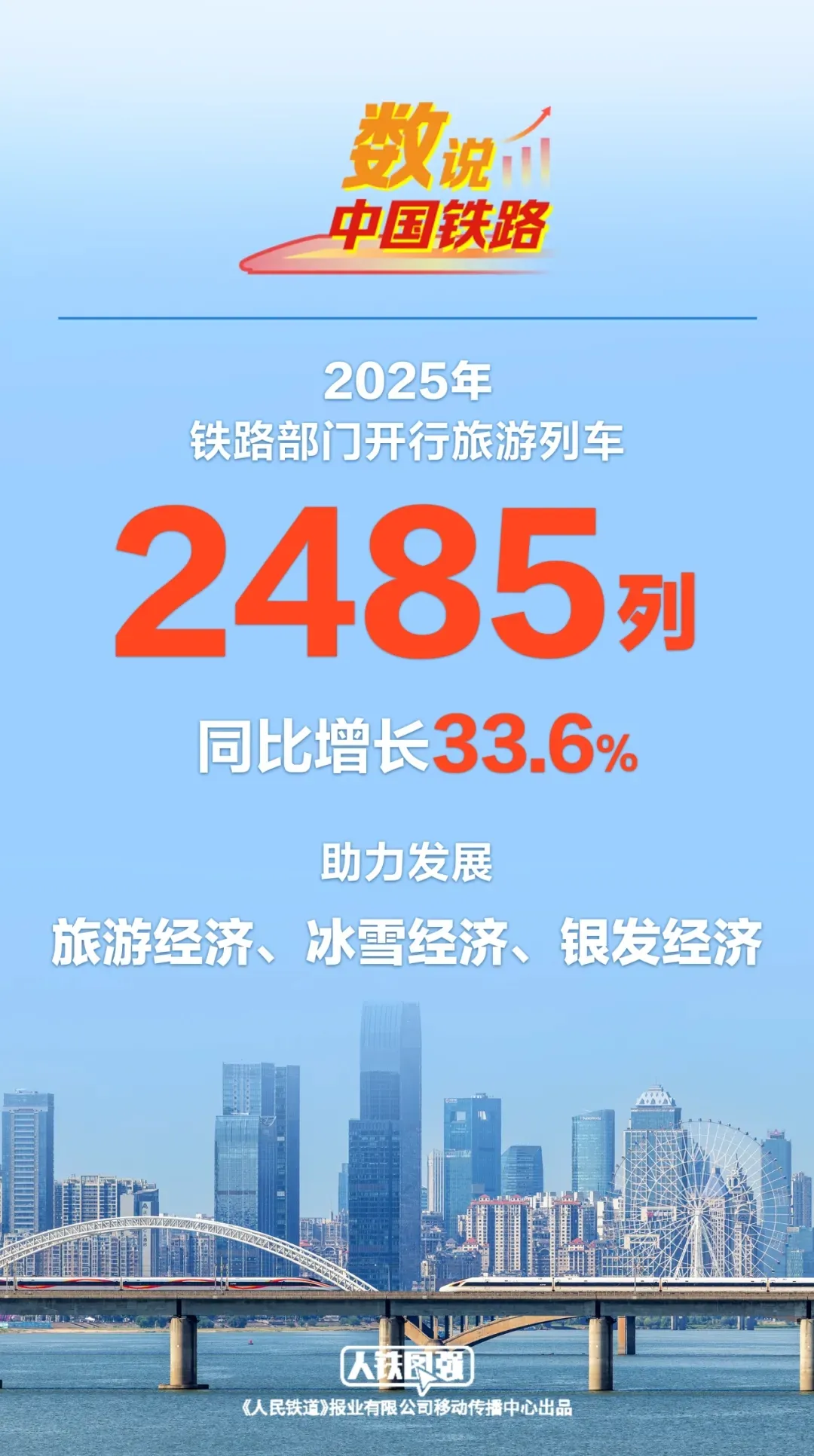 开行旅游列车2485列、同比增长33.6%,助力发展旅游经济、冰雪经济、银发经济。