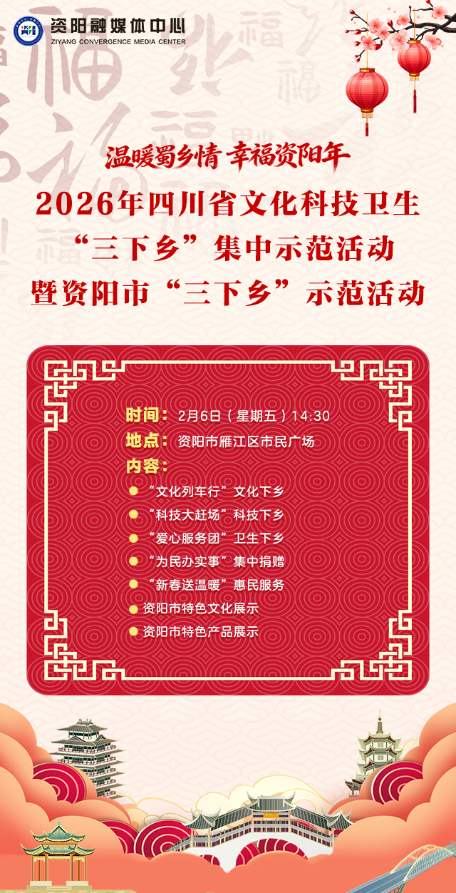 2026年四川省文化科技卫生“三下乡”集中示范活动重磅来袭!2月6日,资阳市雁江区市民广场,文化、科技、健康一站式配齐,邀你把满满福利和浓浓年味一起带回家~