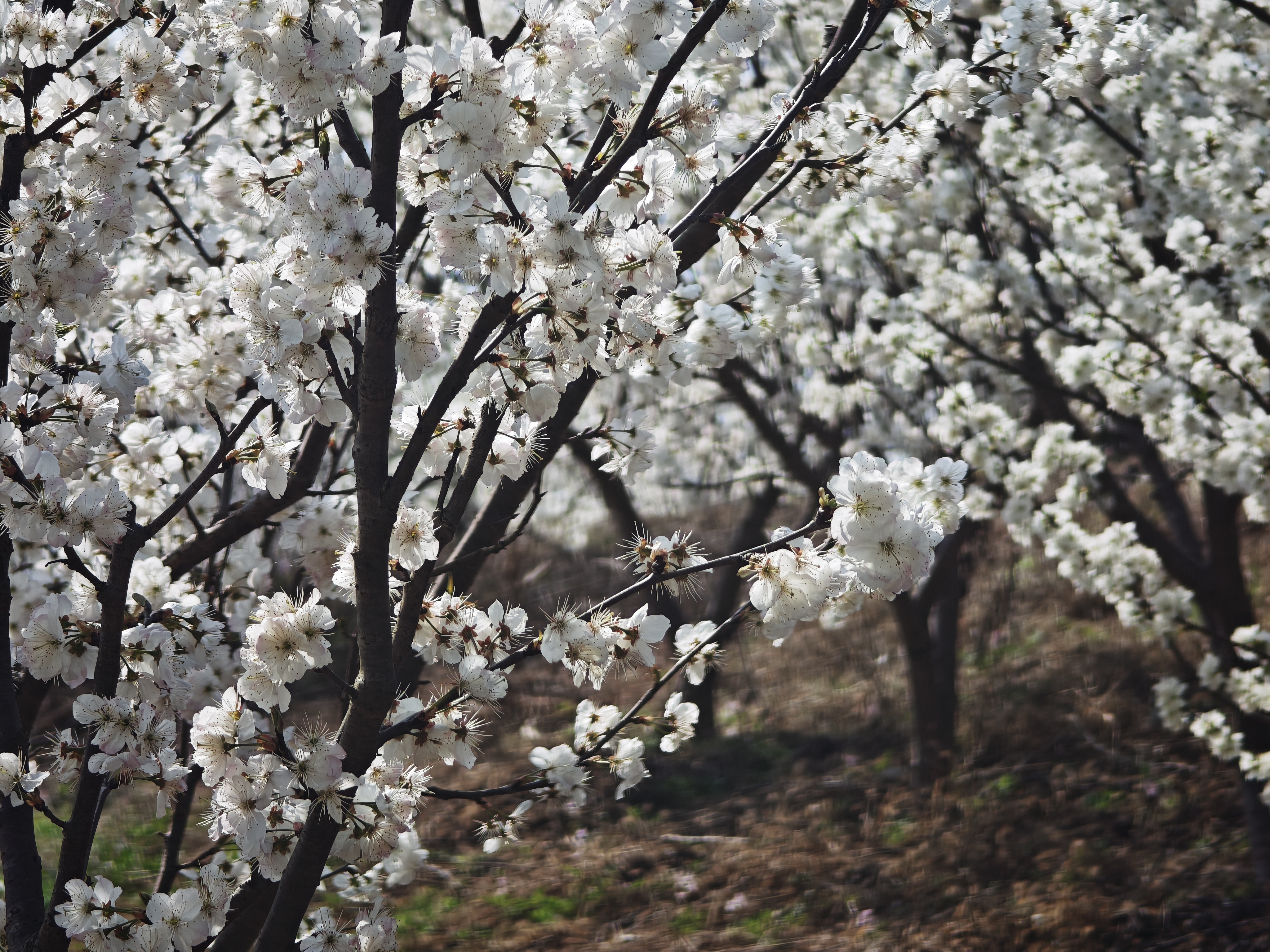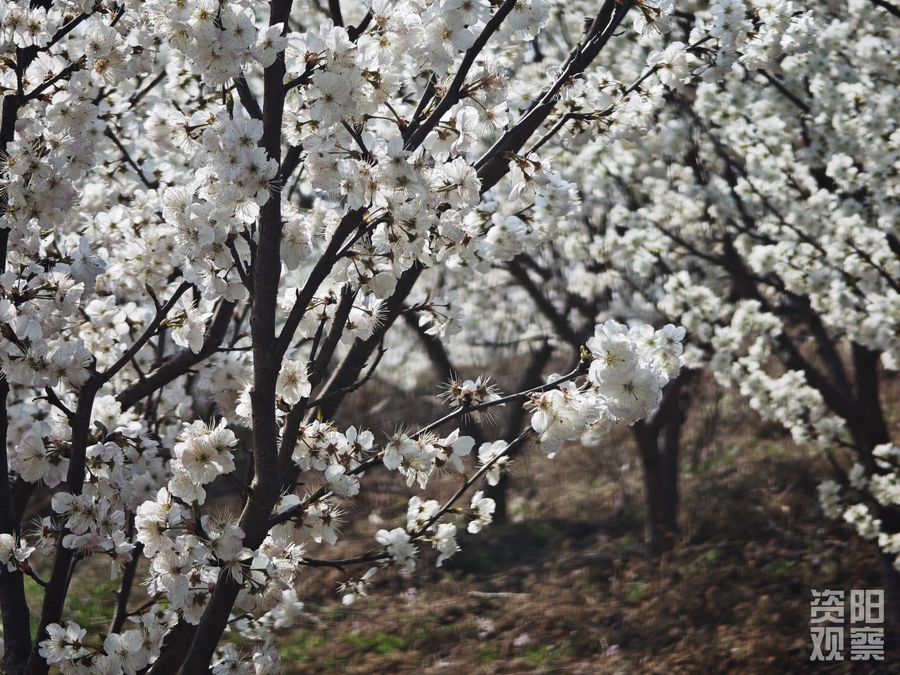 不远处的樱桃采摘园内,40亩樱桃花竞相盛开,层层叠叠的雪白花瓣如云似雪,尽显温柔诗意;相邻的20亩李子园里,洁白的李子花簇拥枝头,与樱桃花相映成辉,汇成一片白色的花海。道路旁、民居庭院前,几株桃树点缀其间,点点嫣红悄然绽放,为春日的金滩村增添了灵动的色彩。