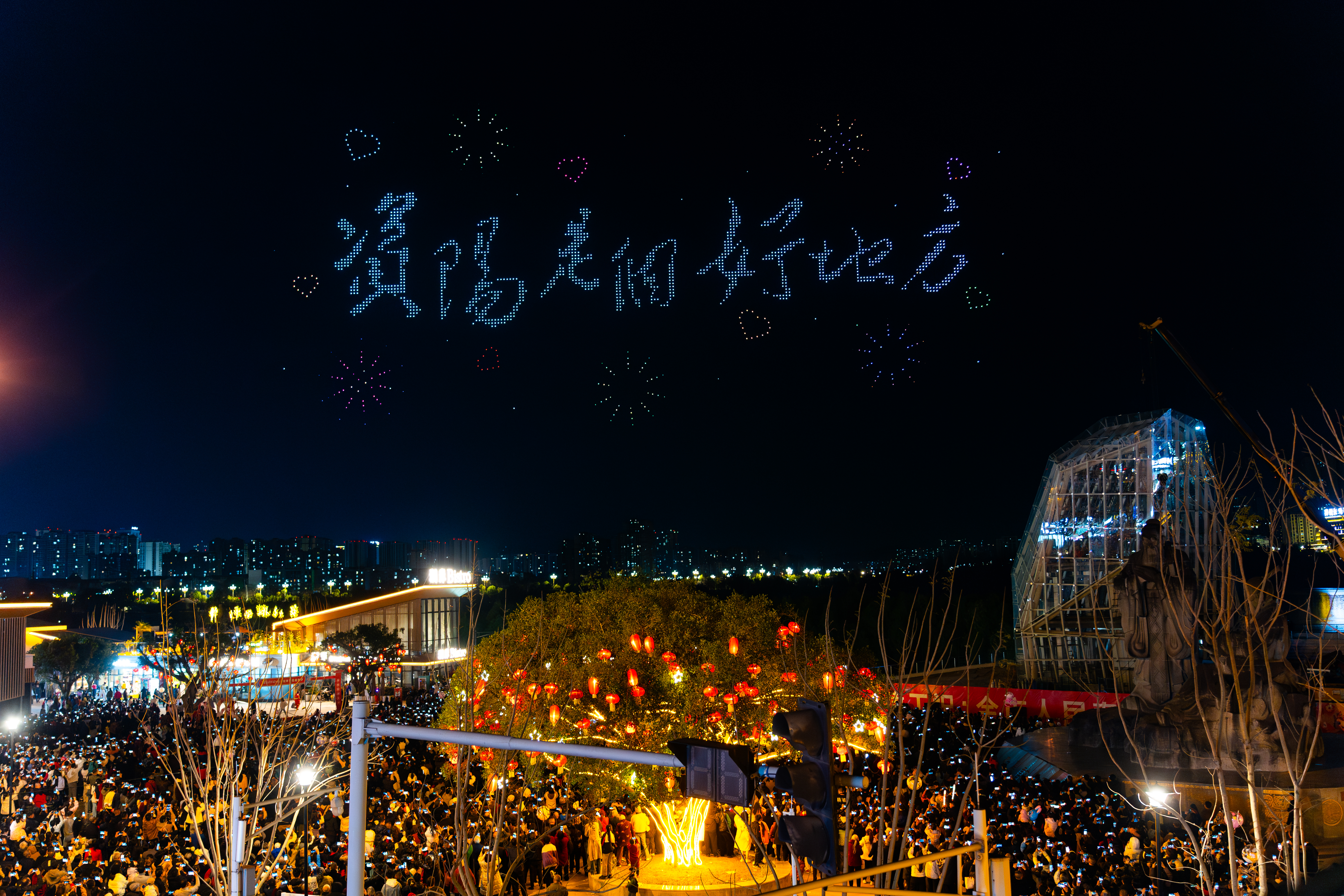 苌弘广场及沱江沿岸,2026架无人机如星河汇聚,以夜空为幕、以灯光为笔,缓缓升起。18分钟的“云端画卷”徐徐展开:资阳铜车马踏云而来,“马到成功”的像素字搭配红包金币点缀,“资阳是个好地方”的核心口号点亮夜空,赢得阵阵喝彩。紫竹观音、濛溪河遗址等文化地标依次显现,城市轨道交通、飞机、摩托、火箭等特色元素接续亮相,用浪漫的光影展现出资阳深厚的历史底蕴与昂扬的发展脉动。