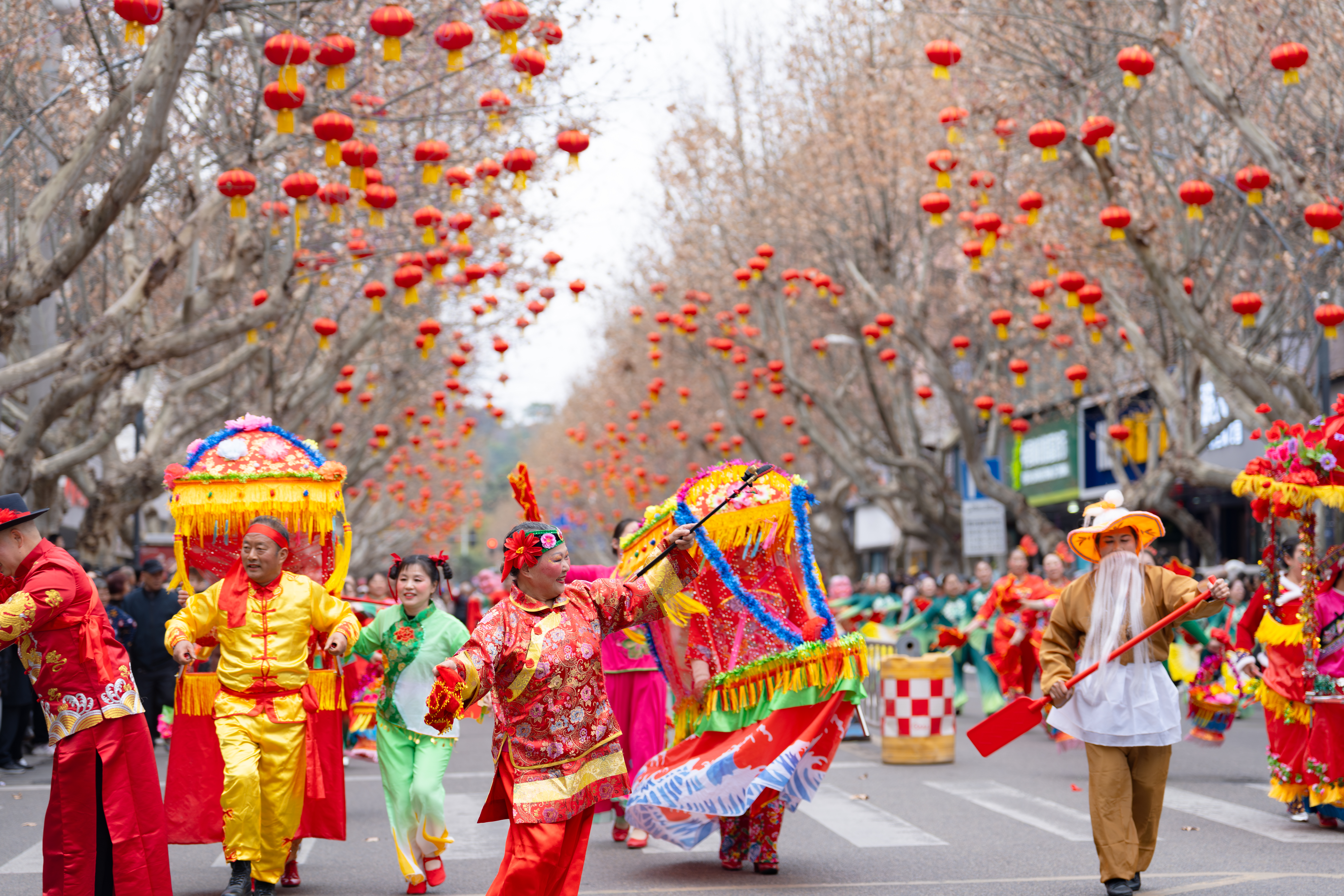锣鼓喧天中,108人的龙狮方队率先登场。雁江、乐至、安岳的龙狮团队各展绝技,其中乐至蟠龙女子舞龙队刚柔并济,尽显帅乡文化魅力;安岳县龙狮队则刚从全省“千龙千狮闹新春”舞台载誉归来;彩条龙融合了传统舞龙文化与现代健身理念。紧随其后的秧歌方队里,花轿旱船相映成趣,媒婆演绎惟妙惟肖,艄公憨态可掬,丫鬟俏皮可爱,勾起观众儿时的记忆。腰鼓连箫方队鼓点铿锵,腰鼓刚猛磅礴,太平鼓灵动婉转,非遗文化与民间技艺在此碰撞出别样火花。压轴的走秀方队则将传统与时尚完美融合:灯笼映红、汉服雅致、旗袍温婉,乐至剪纸旗袍将精巧灵动的剪纸作品融入服饰,凭借独特魅力登上过央视舞台,此刻在家乡街头绽放光彩。