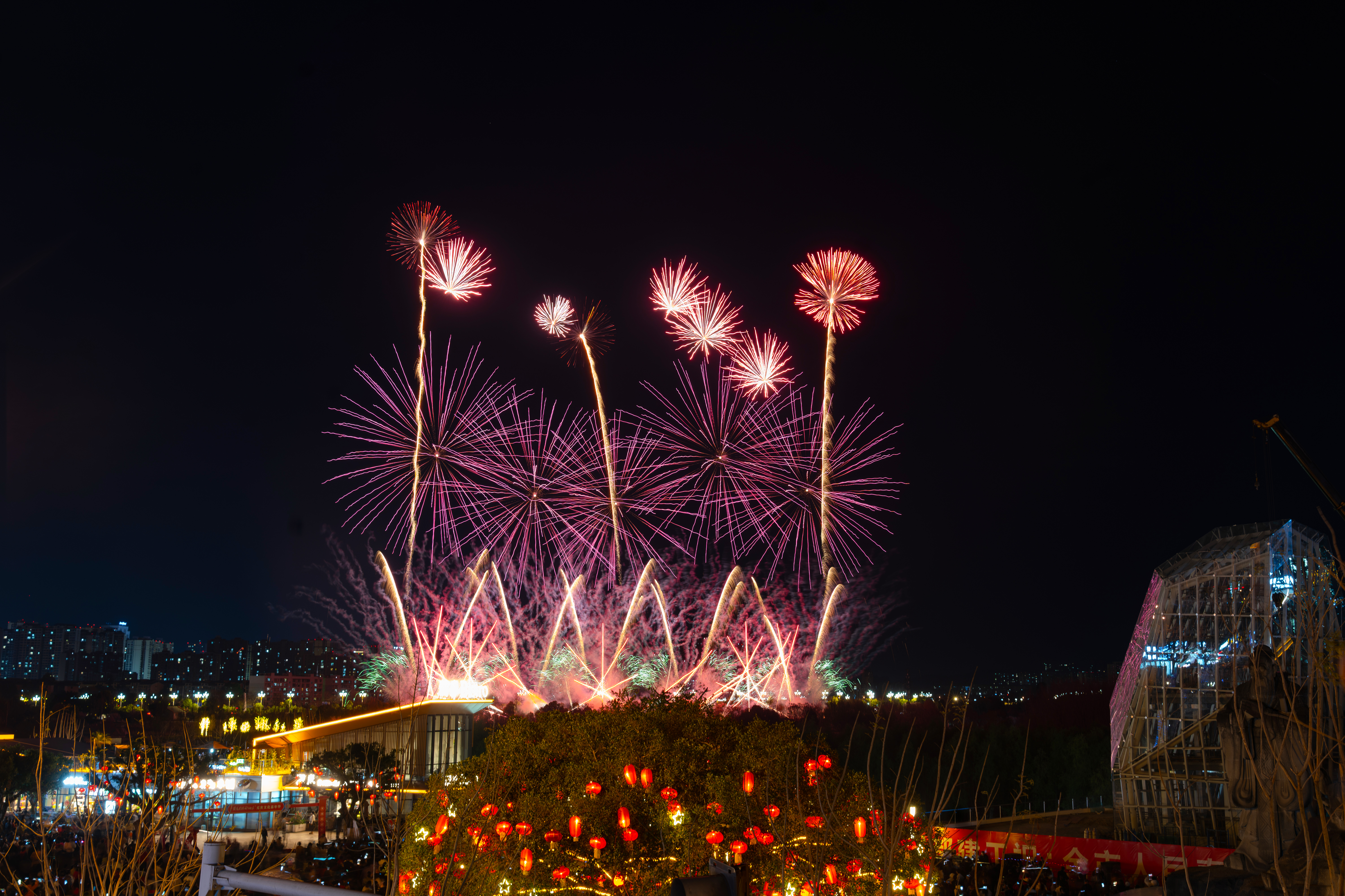 焰火表演分为“古韵传薪·烟火千年”“活力之城·奋进交响”“锦绣蓝图·光启未来”三个篇章。当宽逾数百米的蓝色焰火瀑布倾泻而下,化作浪漫的蓝色流星雨;拔地而起、直冲星空的“生命之树”焰火气势磅礴,成为整场演出的高光时刻。灯光秀与1.5万发礼花弹交相辉映,低空与高空光影层层呼应,绘就出贯通历史、当下与未来的城市画卷。
