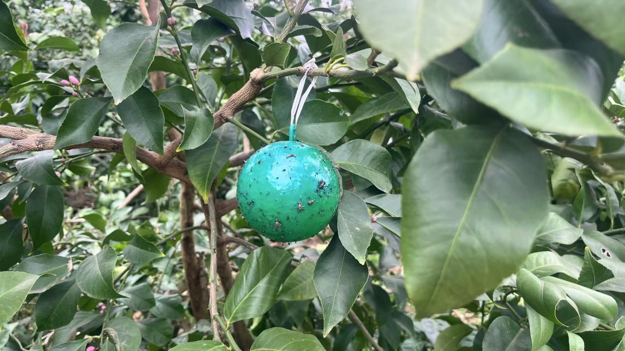 不仅如此,李甲指着枝头悬挂的诱蝇球补充道:“你看这就是农业部门免费发放给我们的‘诱蝇小帮手’,诱杀果实蝇效果特别好,能让果树少打农药,更好地保障柠檬的品质和安全!”