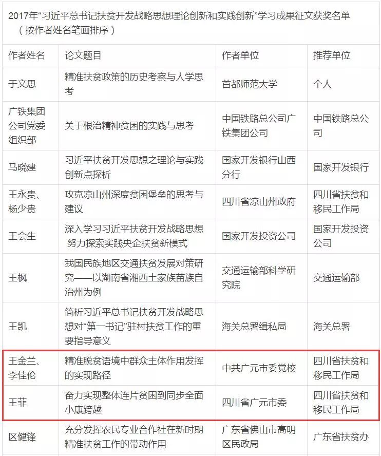 1月13日,国务院扶贫办公示了2017年“习近平总书记扶贫开发战略思想理论创新和实践创新”学习成果征文活动获奖名单,中共广元市委书记王菲撰写的文章《奋力实现整体连片贫困到同步全面小康跨越》和广元市委党校王金兰、李佳伦撰写的《精准脱贫语境中群众主体作用发挥的实现路径》获奖。
