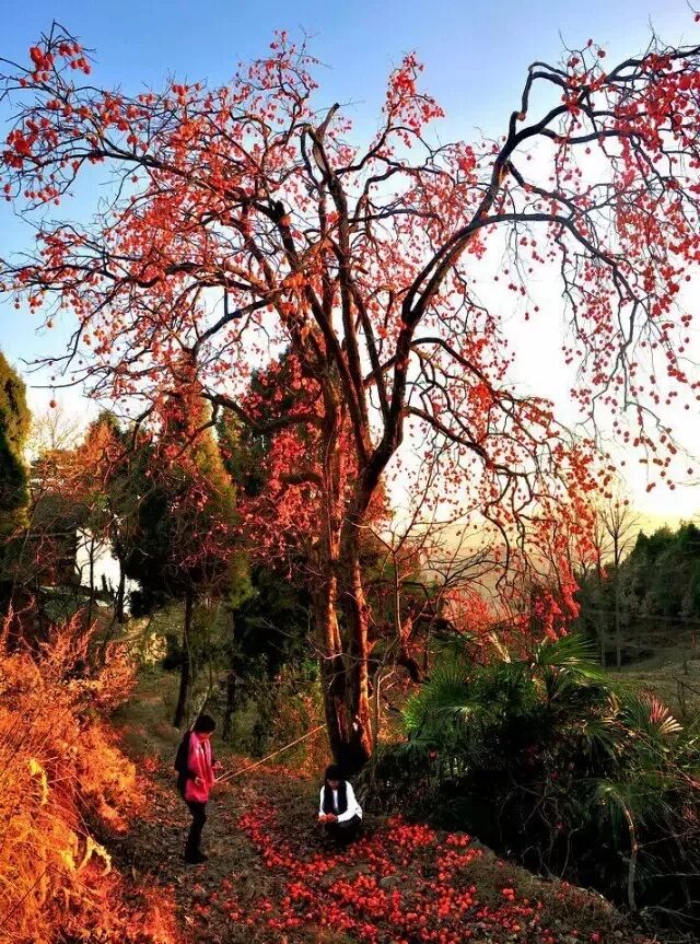 霜降过后,红红的柿子密密匝匝挂在枝头,宛若一个个小小的灯笼,象征着喜庆与祥和。