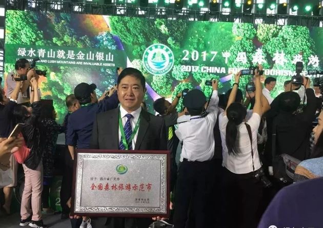 ▲2017年9月25日,广元市委副书记、市长邹自景在上海领受“全国森林旅游示范市”牌匾