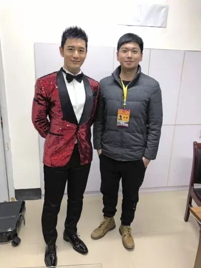 晚会后台,张天奇和黄晓明合影留念