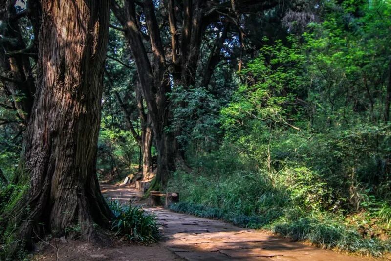 翠云廊,是剑门古蜀道的主要路段,古蜀道是连接四川和中原的一条主要驿道,绵延千里,秦朝称驰道,元朝称驿道,它以剑阁为中心,西至梓潼,北到昭化,南下阆中。在这3条蜿蜒三百里的道路两旁,几人合围才抱得住的古柏修长挺拔,遮天蔽日。