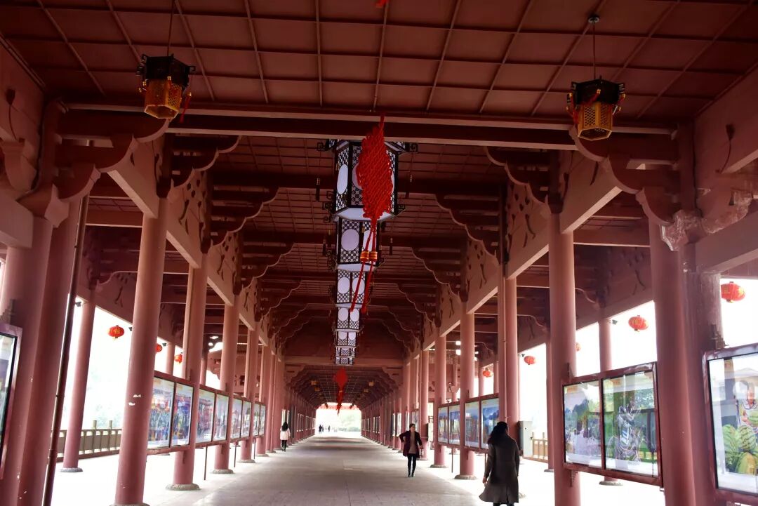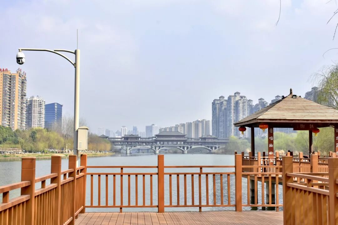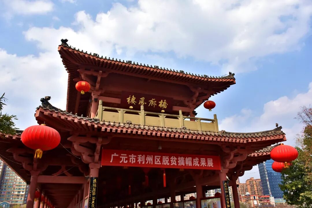 湿地公园景观廊桥座落在东坝新区滨河北路至湿地公园大桥上,桥上有许多摄影作品,展示着广元各地的自然风光与人文风情。